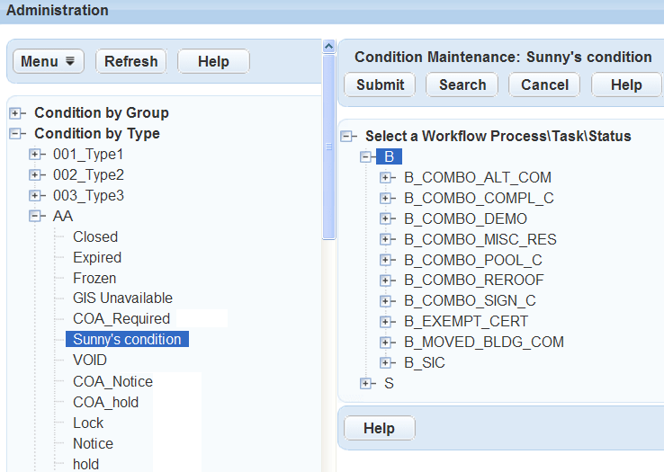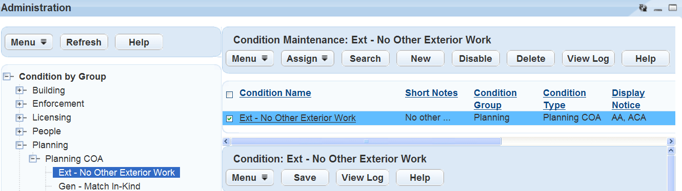 2. Use the main Administration navigation tree to locate the condition you need. You can locate a condition by Group, Condition Type, Name/Number, Application Type, Inspection, User Group, or User. If you cannot locate the condition name you want to apply, you can search for it. Refer to Assigning Conditions.